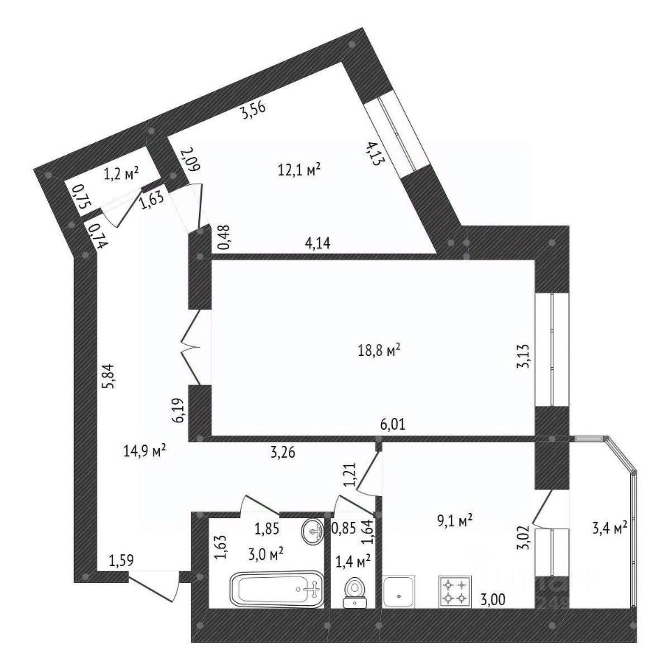 Жилые комнаты 18.8 и 12.1 кв.м.