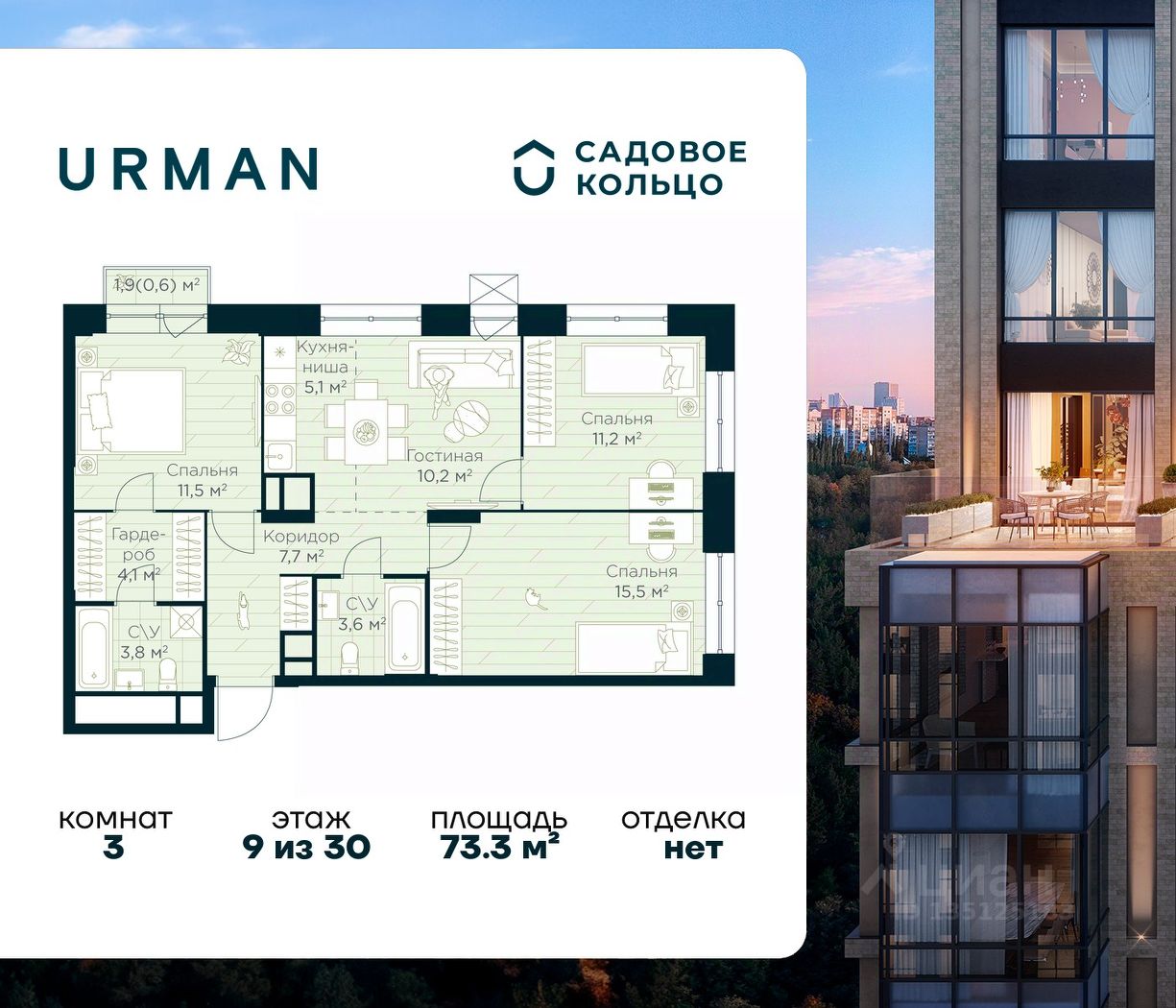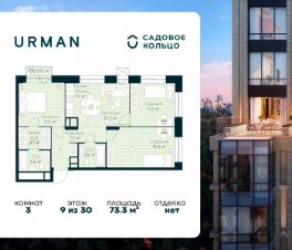 Продается квартира в ЖК Urman City с 3 спальнями на 9 этаже 30 этажного дома. Общая площадь: 73.3 кв.м. Высота потолков 2.95 м. Срок сдачи 1 квартал 2028 г. Мастер-спальня. Вид на лес. Эскроу-счет. Застройщик ГК "Садовое кольцо".