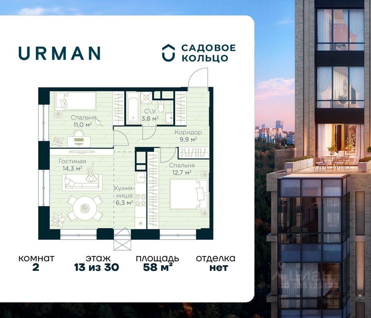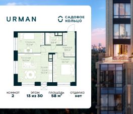 Продается квартира в ЖК Urman City с 2 спальнями на 13 этаже 30 этажного дома. Общая площадь: 58 кв.м. Высота потолков 2.95 м. Срок сдачи 1 квартал 2028 г. Эскроу-счет. Застройщик ГК "Садовое кольцо".