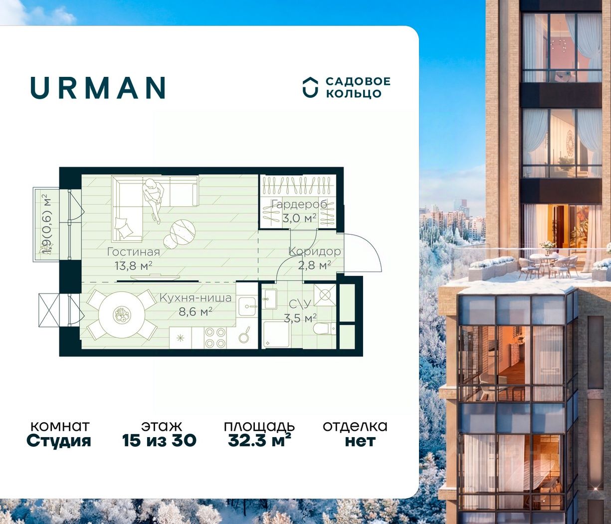 Продается квартира в ЖК Urman City студия на 15 этаже 30 этажного дома. Общая площадь: 32.3 кв.м. Высота потолков 2.95 м. Срок сдачи 1 квартал 2028 г. Эскроу-счет. Застройщик ГК "Садовое кольцо".