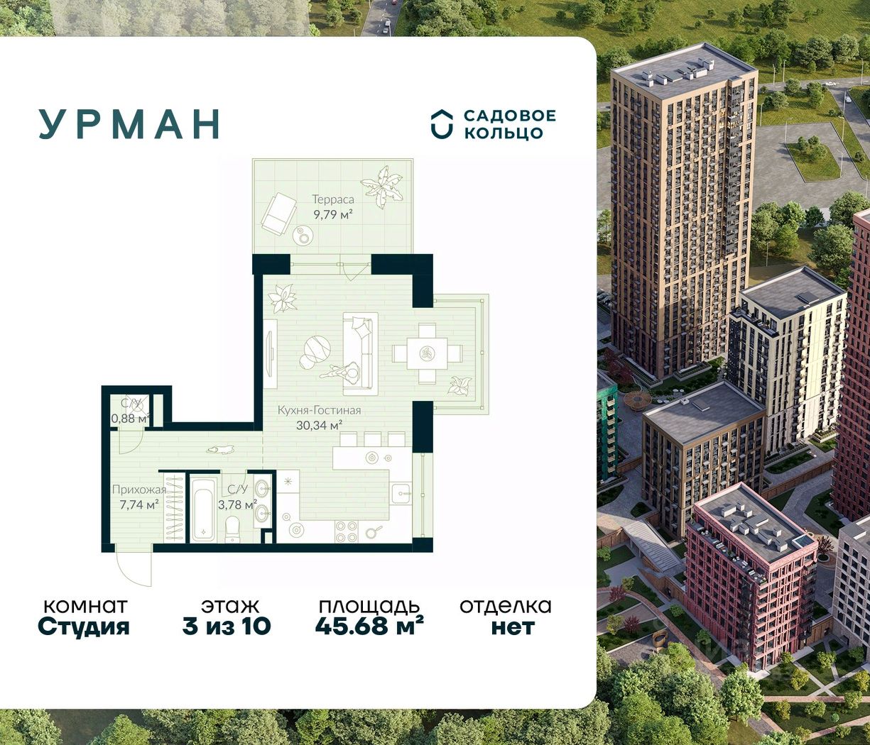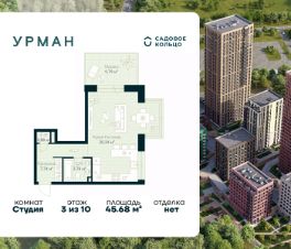 Продается квартира в ЖК Urman City студия на 3 этаже 10 этажного дома. Общая площадь: 45.68 кв.м. Высота потолков 3.4 м. Срок сдачи 2 квартал 2026 г. Окна выходят на 2 стороны. Патио. Угловое остекление. Эскроу-счет. Застройщик ГК "Садовое кольцо".