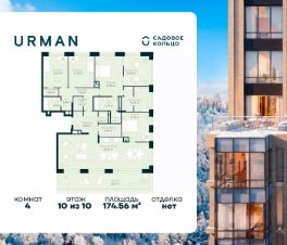 Продается квартира в ЖК Urman City с 4 спальнями на 10 этаже 10 этажного дома. Общая площадь: 174.56 кв.м. Высота потолков 3.4 м. Срок сдачи 2 квартал 2026 г. Окна выходят на 3 стороны. Вид во двор. Сауна. Зимний сад. Мастер-спальня. Терраса. Вид на лес. Вид на воду. Камины + зенитные фонари. Эскроу-счет. Застройщик ГК "Садовое кольцо".