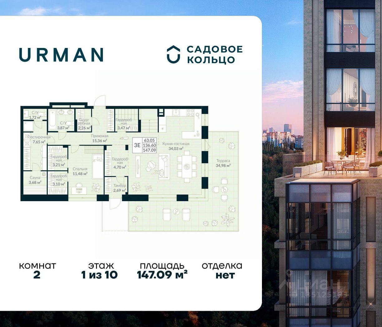 Продается квартира в ЖК Urman City с 2 спальнями на 1 этаже 10 этажного дома. Общая площадь: 147.09 кв.м. Высота потолков 2.7 м. Срок сдачи 2 квартал 2026 г. Окна выходят на 2 стороны. Сауна. Мастер-спальня. Патио. Вид на лес. Угловое остекление. Двухуровневая квартира. Эскроу-счет. Застройщик ГК "Садовое кольцо".