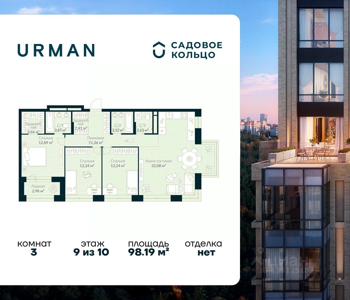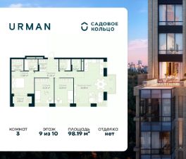Продается квартира в ЖК Urman City с 3 спальнями на 9 этаже 10 этажного дома. Общая площадь: 98.19 кв.м. Высота потолков 3.4 м. Срок сдачи 2 квартал 2026 г. Окна выходят на 2 стороны. Мастер-спальня. Вид на лес. Вид на воду. Угловое остекление. Эркеры. Эскроу-счет. Застройщик ГК "Садовое кольцо".