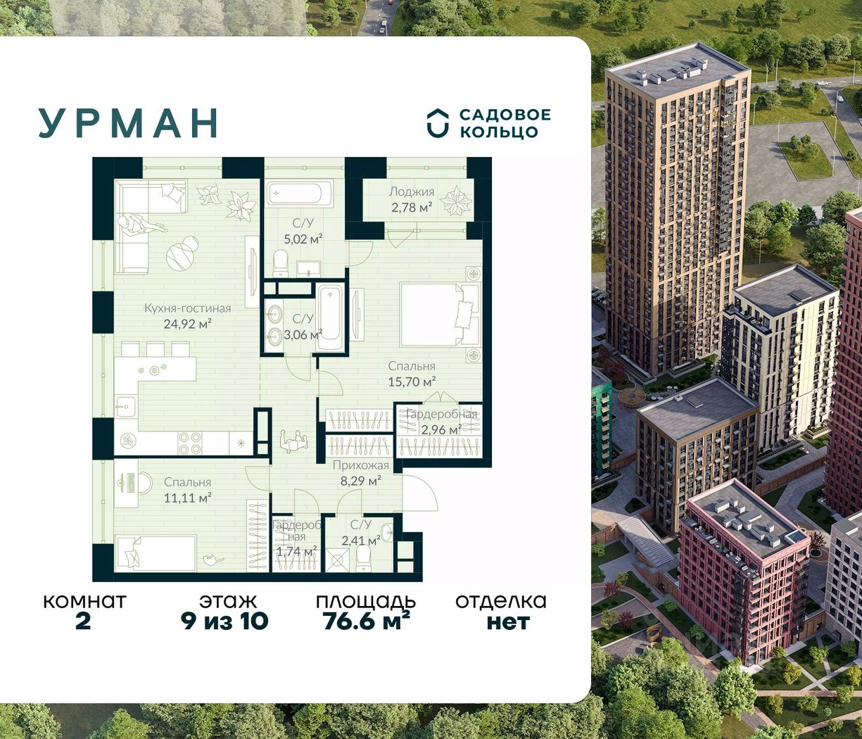 Продается квартира в ЖК Urman City с 2 спальнями на 9 этаже 10 этажного дома. Общая площадь: 76.6 кв.м. Высота потолков 3.4 м. Срок сдачи 2 квартал 2026 г. Окна выходят на 2 стороны. Вид во двор. Мастер-спальня. Вид на лес. Окно в ванной. Эскроу-счет. Застройщик ГК "Садовое кольцо".