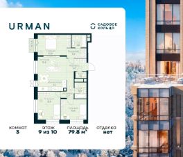 Продается квартира в ЖК Urman City с 3 спальнями на 9 этаже 10 этажного дома. Общая площадь: 79.8 кв.м. Высота потолков 3.4 м. Срок сдачи 1 квартал 2028 г. Мастер-спальня. Эскроу-счет. Застройщик ГК "Садовое кольцо".
