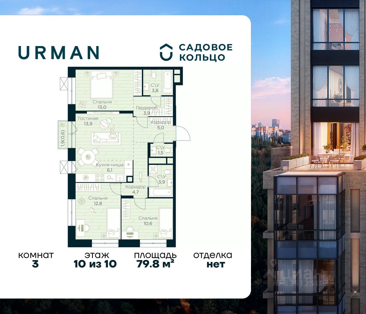 Продается квартира в ЖК Urman City с 3 спальнями на 10 этаже 10 этажного дома. Общая площадь: 79.8 кв.м. Высота потолков 3.4 м. Срок сдачи 1 квартал 2028 г. Мастер-спальня. Эскроу-счет. Застройщик ГК "Садовое кольцо".