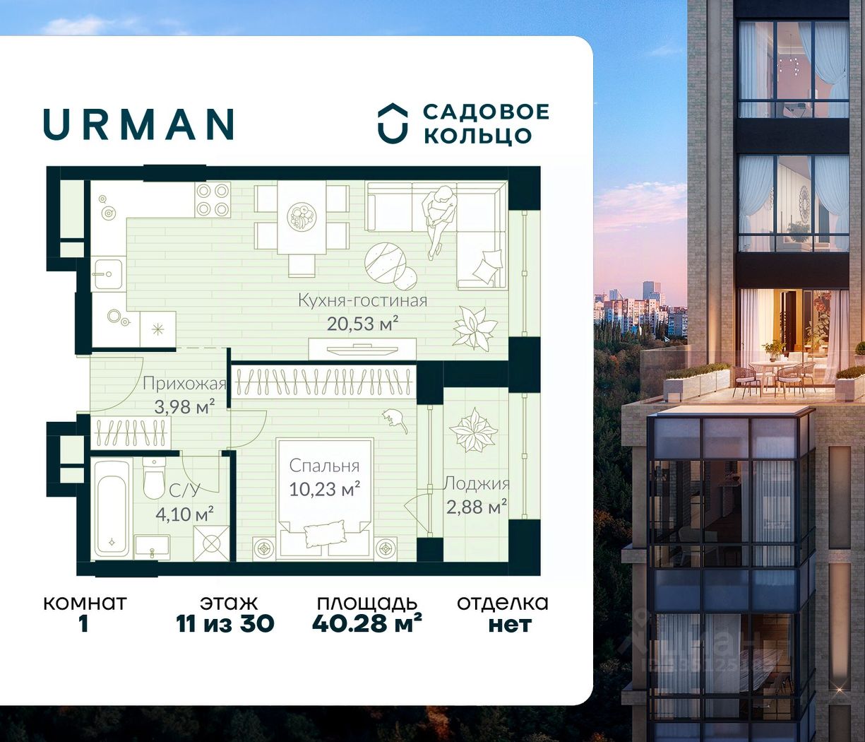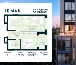 Продается квартира в ЖК Urman City с 1 спальней на 11 этаже 30 этажного дома. Общая площадь: 40.28 кв.м. Высота потолков 2.95 м. Срок сдачи 2 квартал 2026 г. Эскроу-счет. Застройщик ГК "Садовое кольцо".