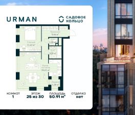 Продается квартира в ЖК Urman City с 1 спальней на 25 этаже 30 этажного дома. Общая площадь: 50.91 кв.м. Высота потолков 2.95 м. Срок сдачи 2 квартал 2026 г. Окна выходят на 2 стороны. Вид во двор. Вид на лес. Вид на воду. Угловое остекление. Эскроу-счет. Застройщик ГК "Садовое кольцо".