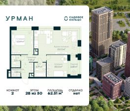 Продается квартира в ЖК Urman City с 2 спальнями на 28 этаже 30 этажного дома. Общая площадь: 62.31 кв.м. Высота потолков 2.95 м. Срок сдачи 2 квартал 2026 г. Окна выходят на 2 стороны. Вид на лес. Вид на воду. Угловое остекление. Эскроу-счет. Застройщик ГК "Садовое кольцо".