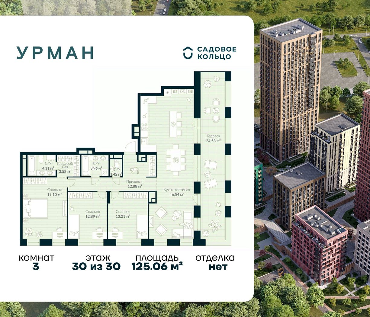 Продается квартира в ЖК Urman City с 3 спальнями на 30 этаже 30 этажного дома. Общая площадь: 125.06 кв.м. Высота потолков 3.4 м. Срок сдачи 2 квартал 2026 г. Окна выходят на 2 стороны. Вид во двор. Мастер-спальня. Терраса. Вид на лес. Вид на воду. Угловое остекление. Камины + зенитные фонари. Эскроу-счет. Застройщик ГК "Садовое кольцо".