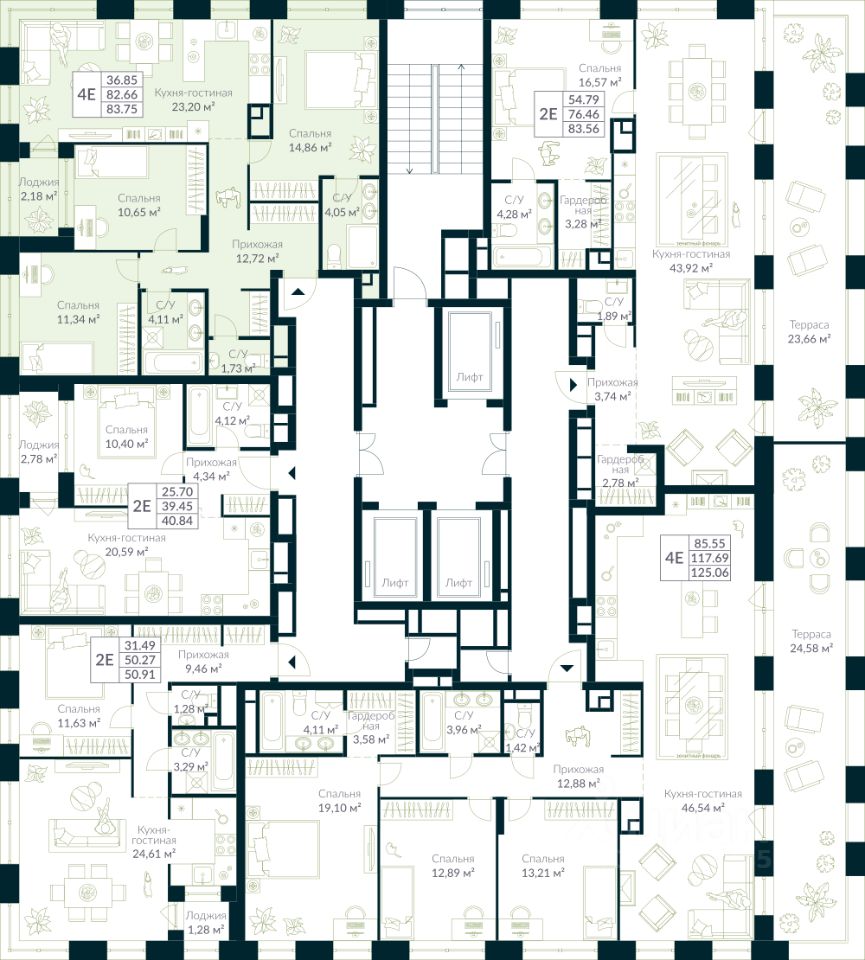 Входные группы оформлены элегантно и продуманно. Акцентные элементы, ландшафтные композиции и представительская зона в стиле эко-лофт создают эффект "портала" в приватный мир комплекса.