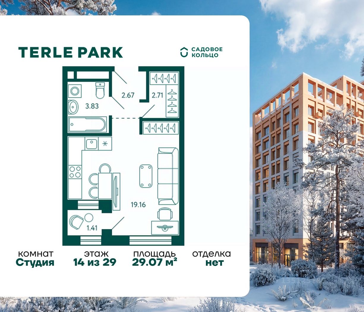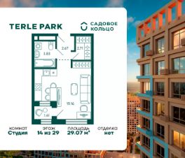 Продается квартира в ЖК Terle Park студия на 14 этаже 29 этажного дома. Общая площадь: 29.07 кв.м. Высота потолков 2.95 м. Срок сдачи 3 квартал 2026 г. Вид на лес. С отделкой White box. Эскроу-счет. Застройщик ГК "Садовое кольцо".