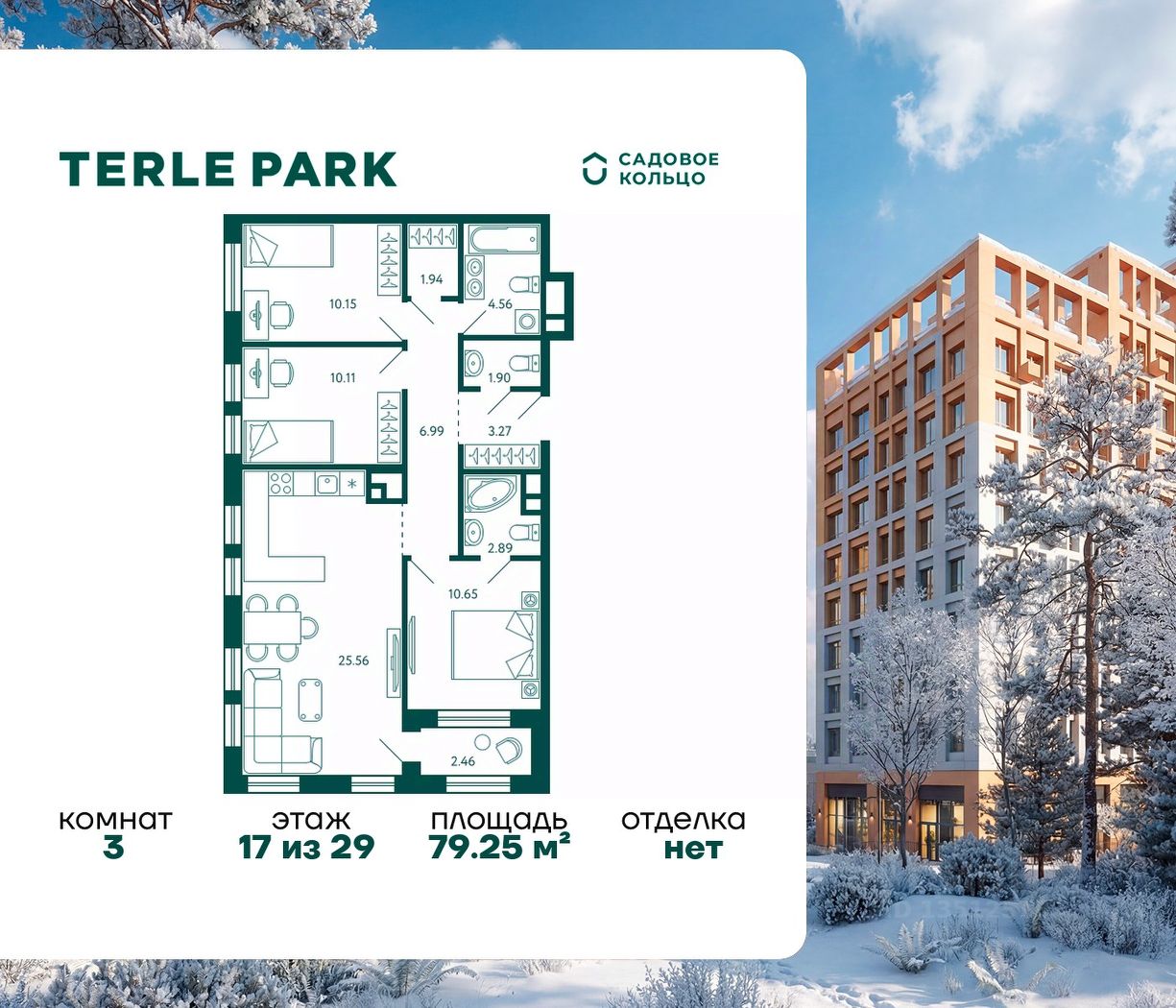 Продается квартира в ЖК Terle Park с 3 спальнями на 17 этаже 29 этажного дома. Общая площадь: 79.25 кв.м. Высота потолков 2.95 м. Срок сдачи 3 квартал 2026 г. Мастер-спальня. Вид на лес. С отделкой White box. Эскроу-счет. Застройщик ГК "Садовое кольцо".