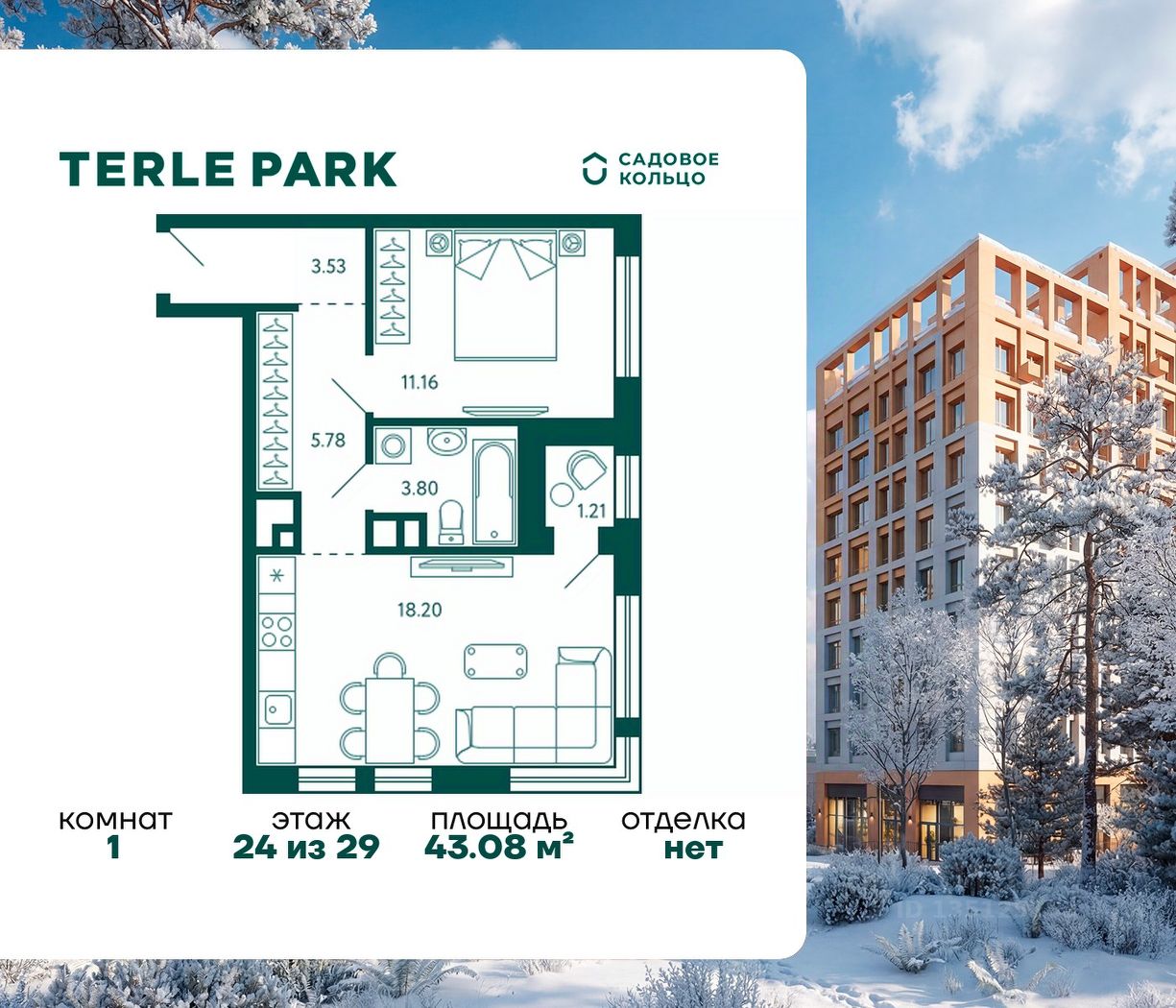 Продается квартира в ЖК Terle Park с 1 спальней на 24 этаже 29 этажного дома. Общая площадь: 43.08 кв.м. Высота потолков 2.95 м. Срок сдачи 3 квартал 2026 г. Вид на лес. Вид на реку. С отделкой White box. Эскроу-счет. Застройщик ГК "Садовое кольцо".