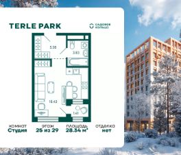 Продается квартира в ЖК Terle Park студия на 25 этаже 29 этажного дома. Общая площадь: 28.34 кв.м. Высота потолков 2.95 м. Срок сдачи 3 квартал 2026 г. Вид на лес. С отделкой White box. Эскроу-счет. Застройщик ГК "Садовое кольцо".