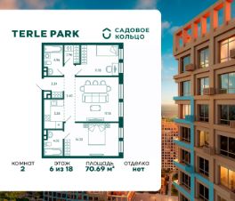 Продается квартира в ЖК Terle Park с 2 спальнями на 6 этаже 18 этажного дома. Общая площадь: 70.69 кв.м. Высота потолков 2.95 м. Срок сдачи 4 квартал 2025 г. Мастер-спальня. Вид на лес. Эскроу-счет. Застройщик ГК "Садовое кольцо".