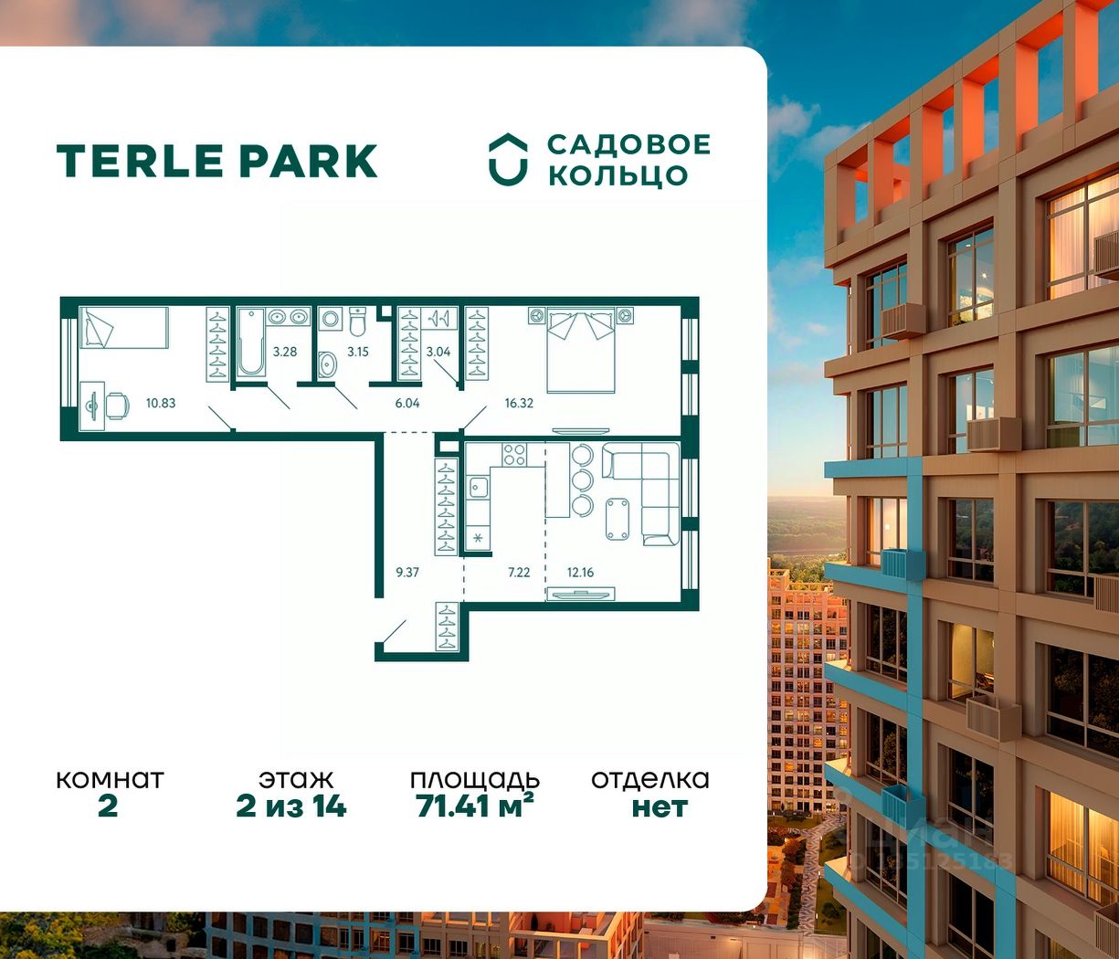 Продается квартира в ЖК Terle Park с 2 спальнями на 2 этаже 14 этажного дома. Общая площадь: 71.41 кв.м. Высота потолков 2.95 м. Срок сдачи 4 квартал 2025 г. Вид на лес. Эскроу-счет. Застройщик ГК "Садовое кольцо".