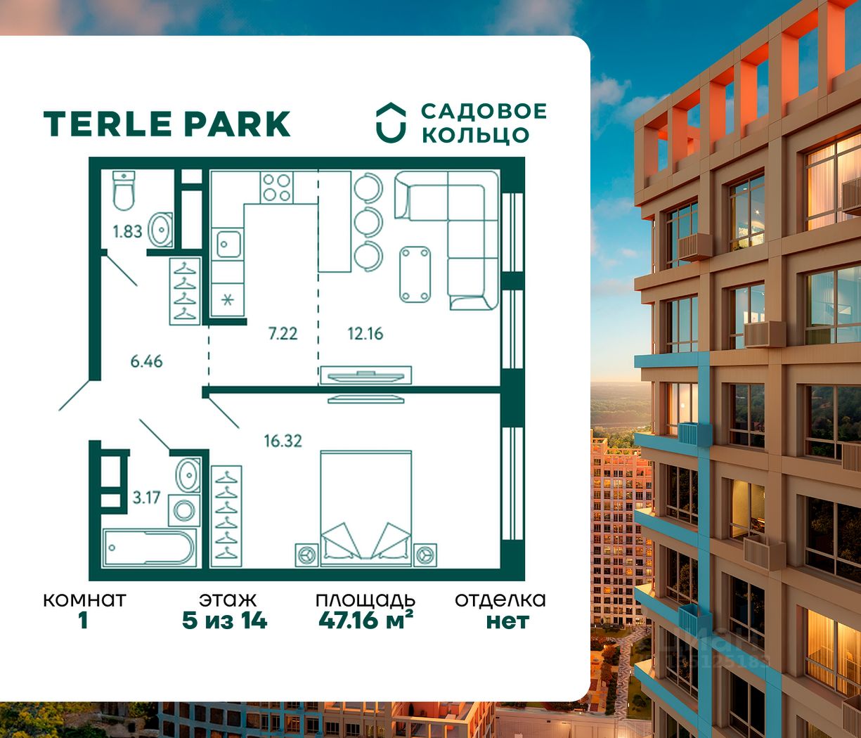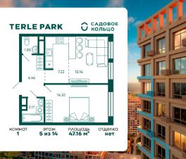 Продается квартира в ЖК Terle Park с 1 спальней на 5 этаже 14 этажного дома. Общая площадь: 47.16 кв.м. Высота потолков 2.95 м. Срок сдачи 4 квартал 2025 г. Вид на лес. Эскроу-счет. Застройщик ГК "Садовое кольцо".