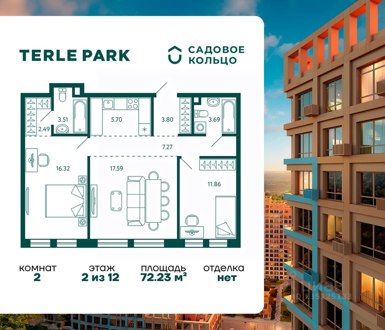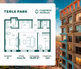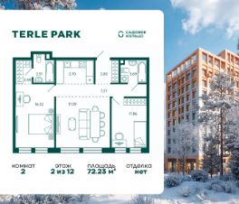 Продается квартира в ЖК Terle Park с 2 спальнями на 2 этаже 12 этажного дома. Общая площадь: 72.23 кв.м. Высота потолков 2.95 м. Срок сдачи 4 квартал 2025 г. Мастер-спальня. Вид на лес. Эскроу-счет. Застройщик ГК "Садовое кольцо".