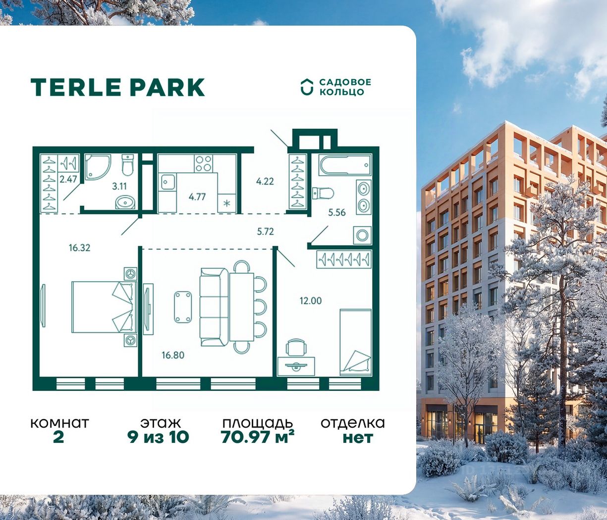 Продается квартира в ЖК Terle Park с 2 спальнями на 9 этаже 10 этажного дома. Общая площадь: 70.97 кв.м. Высота потолков 2.95 м. Срок сдачи 4 квартал 2025 г. Мастер-спальня. Вид на лес. Вид на реку. Эскроу-счет. Застройщик ГК "Садовое кольцо".