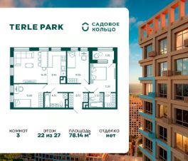 Продается квартира в ЖК Terle Park с 3 спальнями на 22 этаже 27 этажного дома. Общая площадь: 78.14 кв.м. Высота потолков 2.95 м. Срок сдачи 4 квартал 2025 г. Мастер-спальня. Вид на лес. Вид на реку. С отделкой White box. Эскроу-счет. Застройщик ГК "Садовое кольцо".