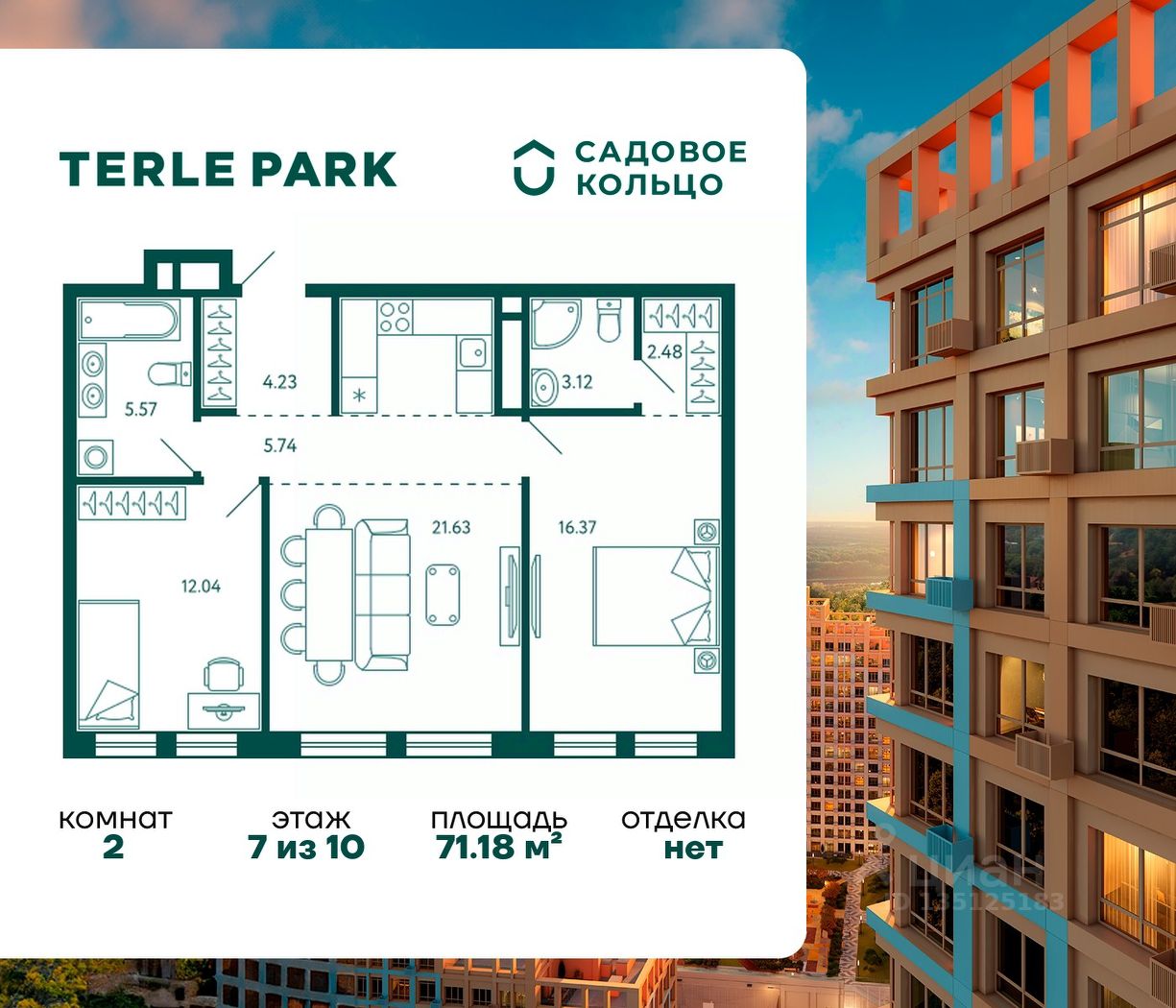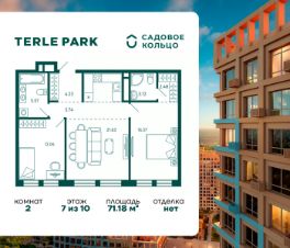 Продается квартира в ЖК Terle Park с 2 спальнями на 7 этаже 10 этажного дома. Общая площадь: 71.18 кв.м. Высота потолков 2.95 м. Срок сдачи 3 квартал 2026 г. Мастер-спальня. Вид на лес. Эскроу-счет. Застройщик ГК "Садовое кольцо".