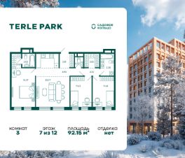 Продается квартира в ЖК Terle Park с 3 спальнями на 7 этаже 12 этажного дома. Общая площадь: 92.15 кв.м. Высота потолков 2.95 м. Срок сдачи 3 квартал 2026 г. Мастер-спальня. Вид на лес. Эскроу-счет. Застройщик ГК "Садовое кольцо".