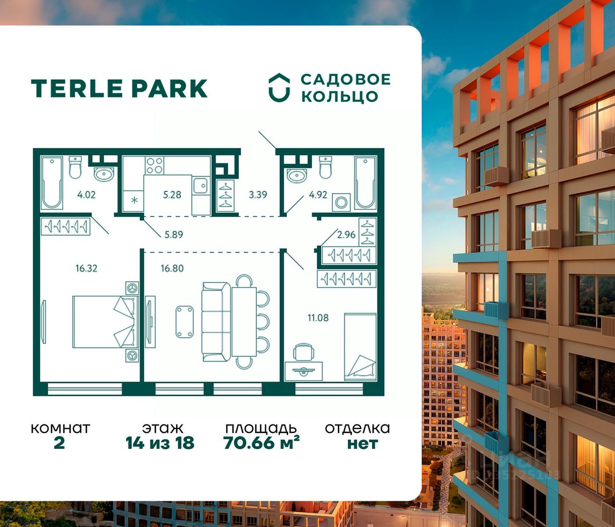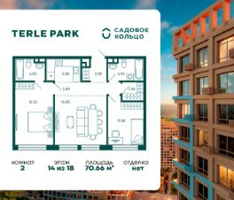 Продается квартира в ЖК Terle Park с 2 спальнями на 14 этаже 18 этажного дома. Общая площадь: 70.66 кв.м. Высота потолков 3.1 м. Срок сдачи 4 квартал 2025 г. Мастер-спальня. Вид на лес. Вид на реку. Эскроу-счет. Застройщик ГК "Садовое кольцо".