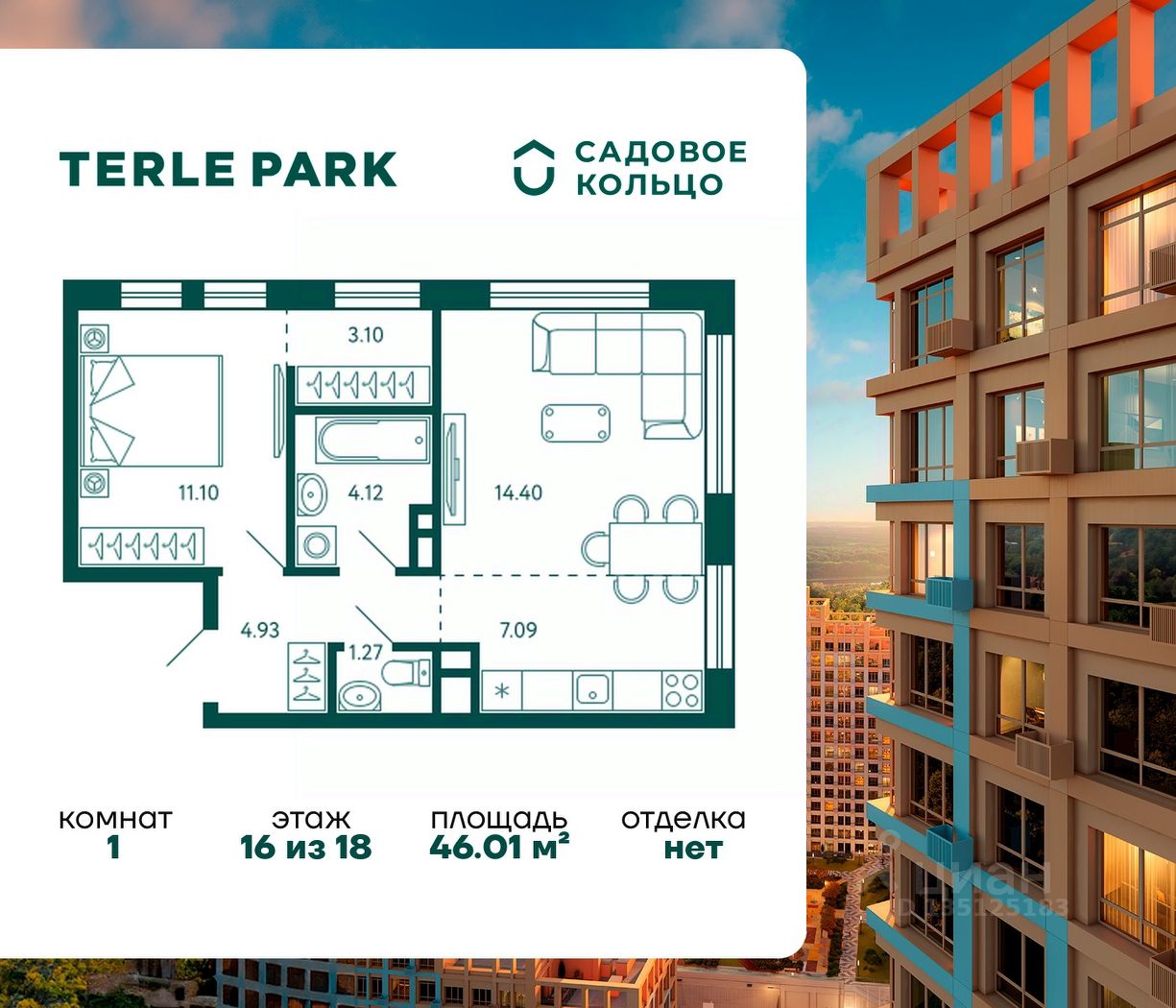 Продается квартира в ЖК Terle Park с 1 спальней на 16 этаже 18 этажного дома. Общая площадь: 46.01 кв.м. Высота потолков 3.1 м. Срок сдачи 4 квартал 2025 г. Вид на лес. Вид на реку. Эскроу-счет. Застройщик ГК "Садовое кольцо".