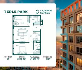 Продается квартира в ЖК Terle Park с 2 спальнями на 3 этаже 10 этажного дома. Общая площадь: 71.29 кв.м. Высота потолков 2.95 м. Срок сдачи 4 квартал 2025 г. Мастер-спальня. Эскроу-счет. Застройщик ГК "Садовое кольцо".