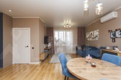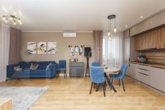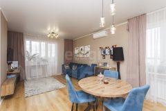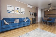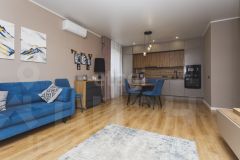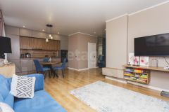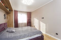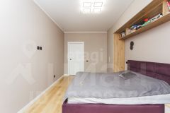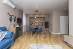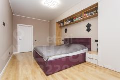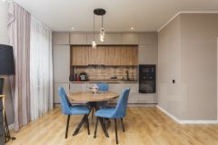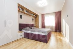 Покупателю остаются мебель в спальне (кровать, прикроватные тумбы), мебель и техника на кухне: встроенная кухня, варочная панель (индукция), духовой шкаф, вытяжка, посудомоечная машина, встроенные холодильник и микроволновка, стол и стулья.