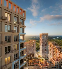 Подъезды расположены на уровне земли — удобно для колясок, велосипедов и самокатов. Лобби в светлой палитре с зелёными и оранжевыми акцентами дополняет рабочая зона для встреч и онлайн-конференций. В домах предусмотрены современные бесшумные лифты.