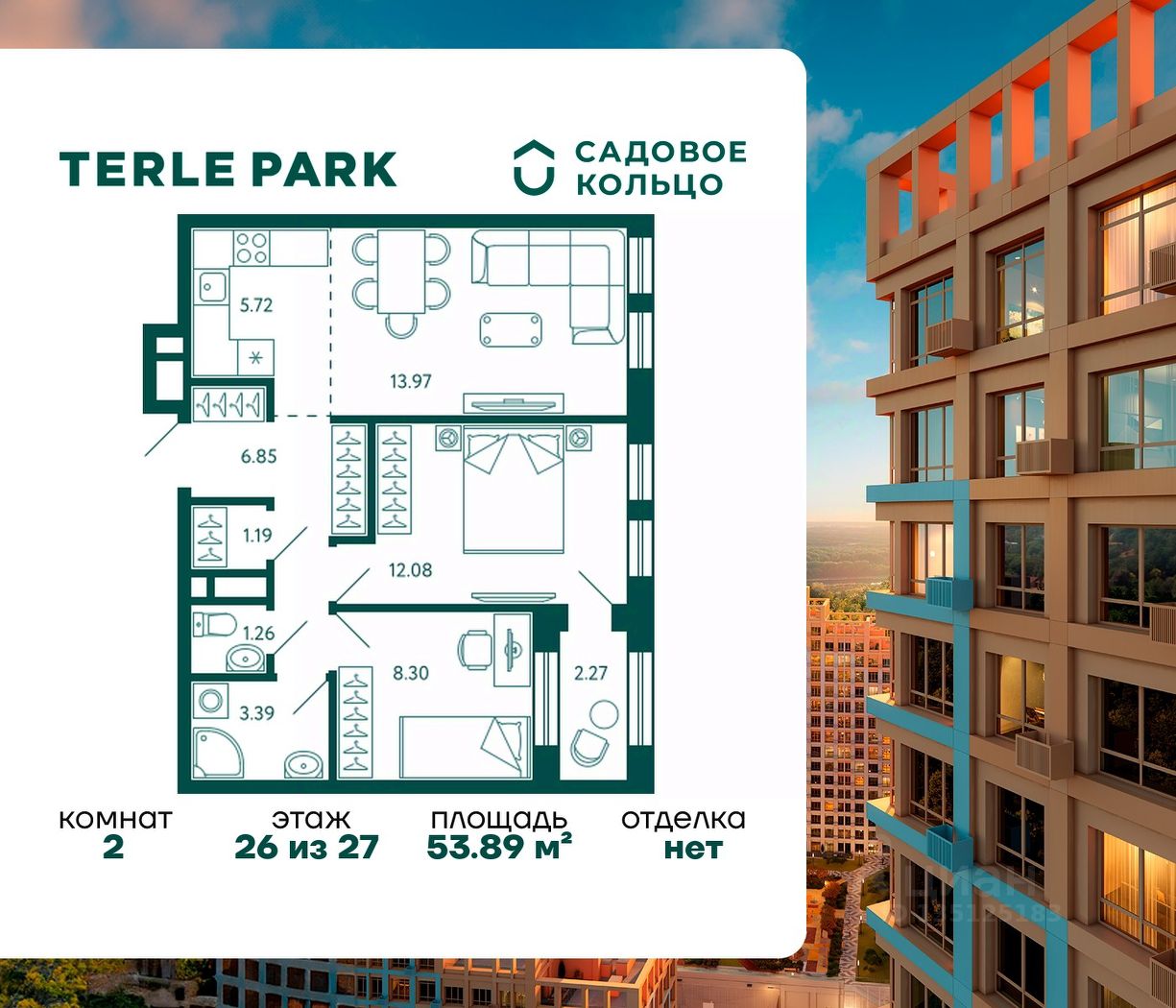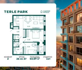Продается квартира в ЖК Terle Park с 2 спальнями на 26 этаже 27 этажного дома. Общая площадь: 53.89 кв.м. Высота потолков 2.95 м. Срок сдачи 4 квартал 2025 г. Вид на лес. Вид на реку. С отделкой White box. Эскроу-счет. Застройщик ГК "Садовое кольцо".