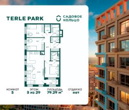 Продается квартира в ЖК Terle Park с 3 спальнями на 3 этаже 29 этажного дома. Общая площадь: 79.29 кв.м. Высота потолков 2.95 м. Срок сдачи 3 квартал 2026 г. Мастер-спальня. С отделкой White box. Эскроу-счет. Застройщик ГК "Садовое кольцо".