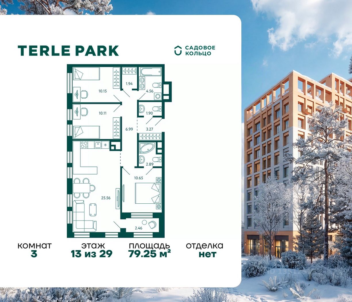 Продается квартира в ЖК Terle Park с 3 спальнями на 13 этаже 29 этажного дома. Общая площадь: 79.25 кв.м. Высота потолков 2.95 м. Срок сдачи 3 квартал 2026 г. Мастер-спальня. Вид на лес. С отделкой White box. Эскроу-счет. Застройщик ГК "Садовое кольцо".