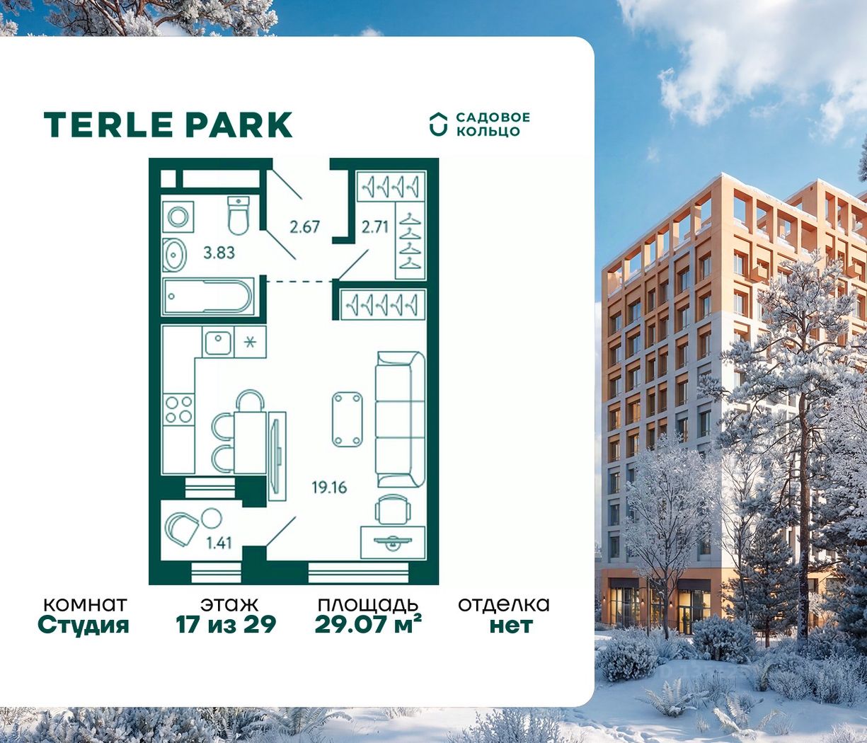 Продается квартира в ЖК Terle Park студия на 17 этаже 29 этажного дома. Общая площадь: 29.07 кв.м. Высота потолков 2.95 м. Срок сдачи 3 квартал 2026 г. Вид на лес. С отделкой White box. Эскроу-счет. Застройщик ГК "Садовое кольцо".