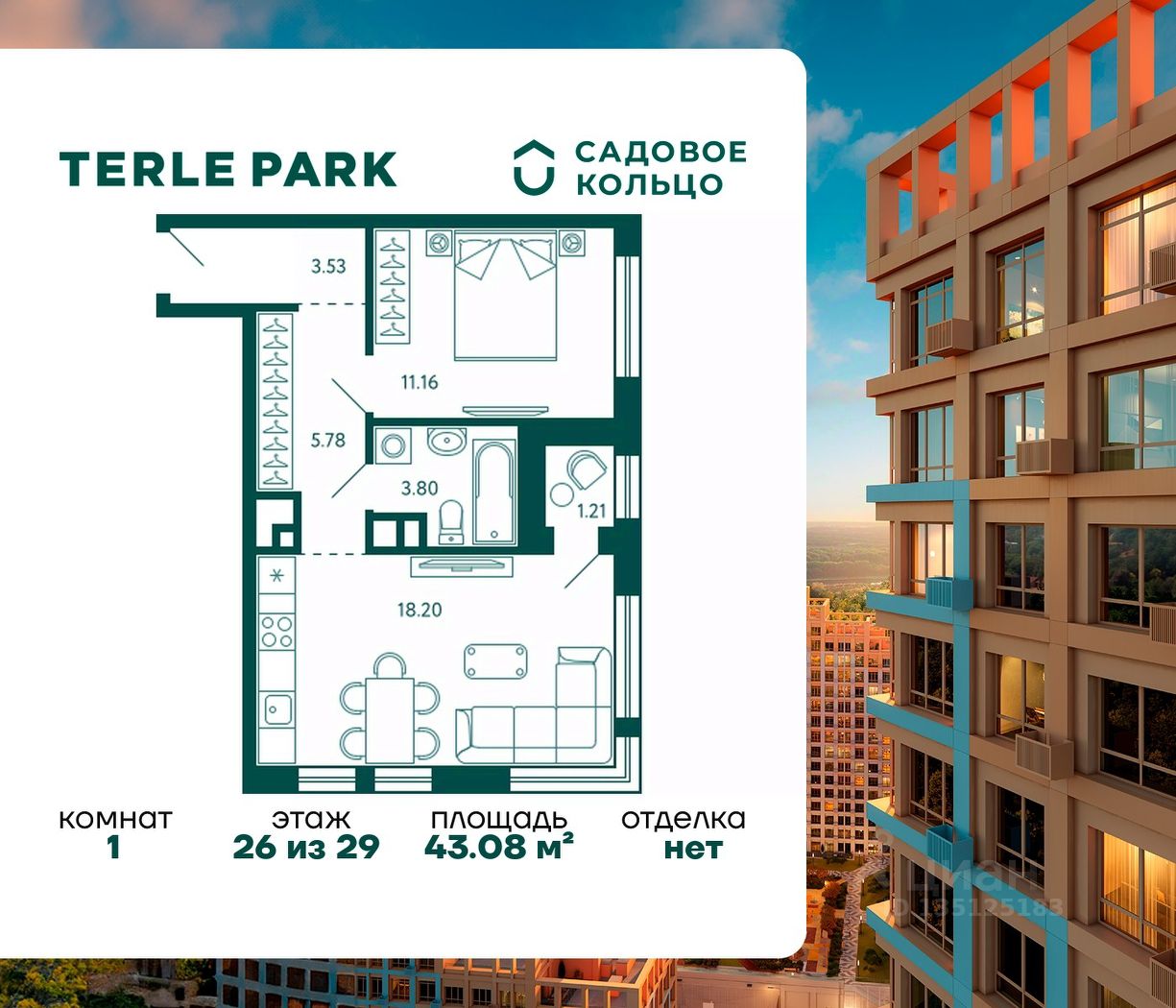 Продается квартира в ЖК Terle Park с 1 спальней на 26 этаже 29 этажного дома. Общая площадь: 43.08 кв.м. Высота потолков 2.95 м. Срок сдачи 3 квартал 2026 г. Вид на лес. Вид на реку. С отделкой White box. Эскроу-счет. Застройщик ГК "Садовое кольцо".