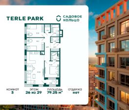 Продается квартира в ЖК Terle Park с 3 спальнями на 26 этаже 29 этажного дома. Общая площадь: 79.25 кв.м. Высота потолков 2.95 м. Срок сдачи 3 квартал 2026 г. Мастер-спальня. Вид на лес. С отделкой White box. Эскроу-счет. Застройщик ГК "Садовое кольцо".