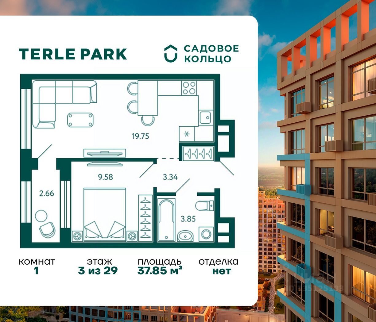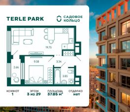 Продается квартира в ЖК Terle Park с 1 спальней на 3 этаже 29 этажного дома. Общая площадь: 37.85 кв.м. Высота потолков 2.95 м. Срок сдачи 3 квартал 2026 г. Вид на лес. С отделкой White box. Эскроу-счет. Застройщик ГК "Садовое кольцо".