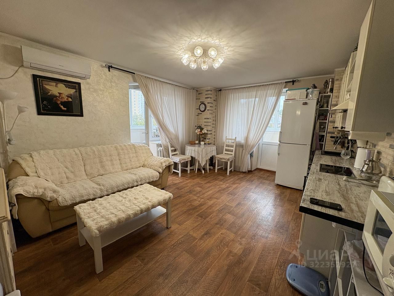 Кухня-гостиная 24,4 кв.м и плюс две лоджии застекленные по 1,6 кв.м. , спальня 9, 8 кв.м. , вторая спальня 14,9 кв.м., санузел раздельный .