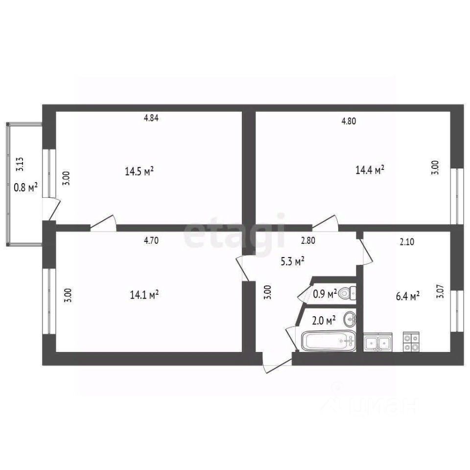 — Общая площадь: 57,6 м²