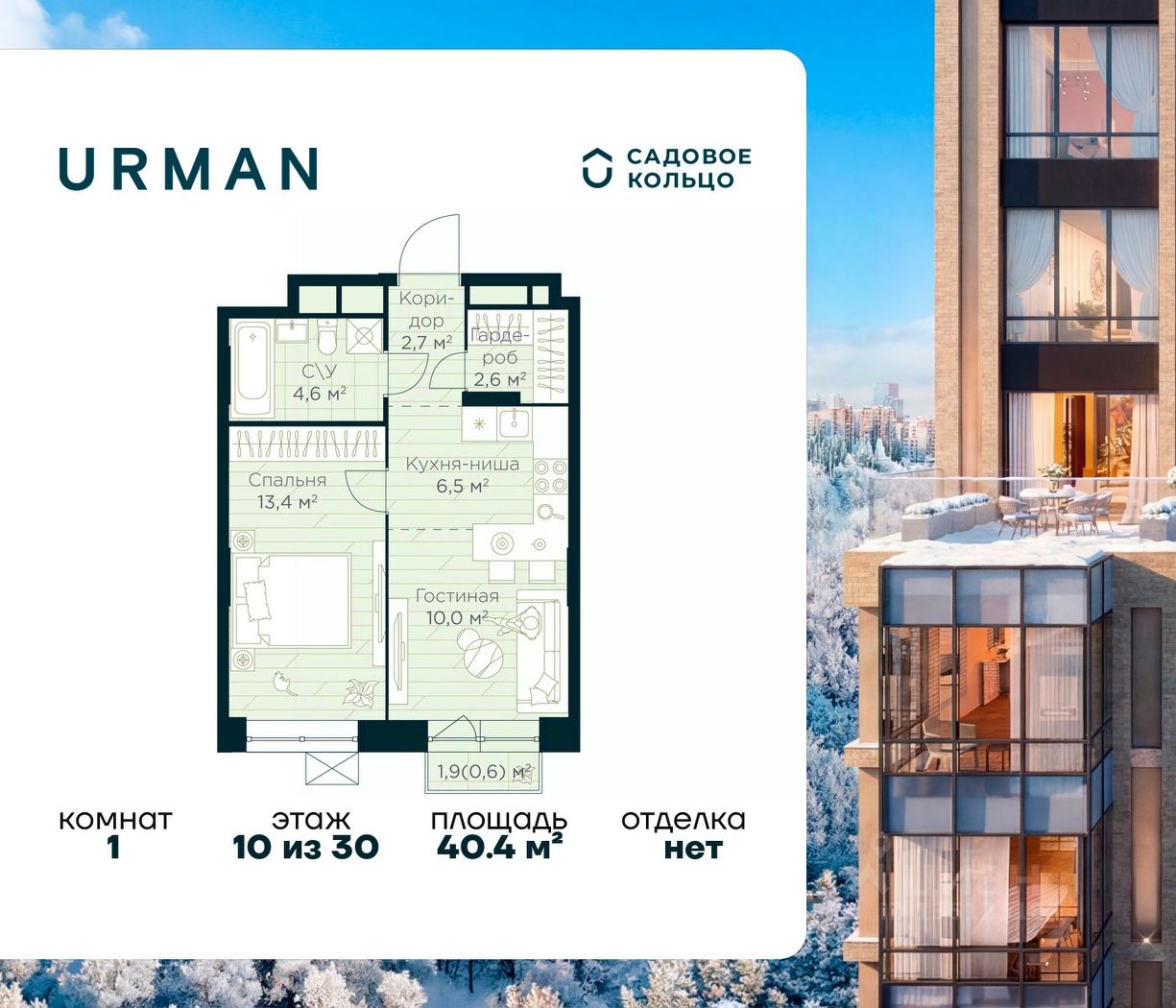 Продается квартира в ЖК Urman City с 1 спальней на 10 этаже 30 этажного дома. Общая площадь: 40.4 кв.м. Высота потолков 2.95 м. Срок сдачи 1 квартал 2028 г. Эскроу-счет. Застройщик ГК "Садовое кольцо".