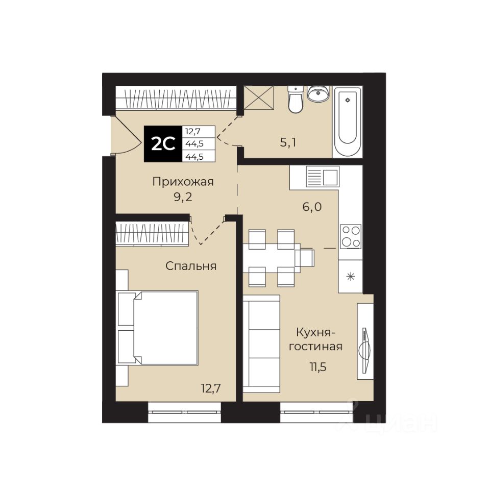 Общая площадь44,5 м²