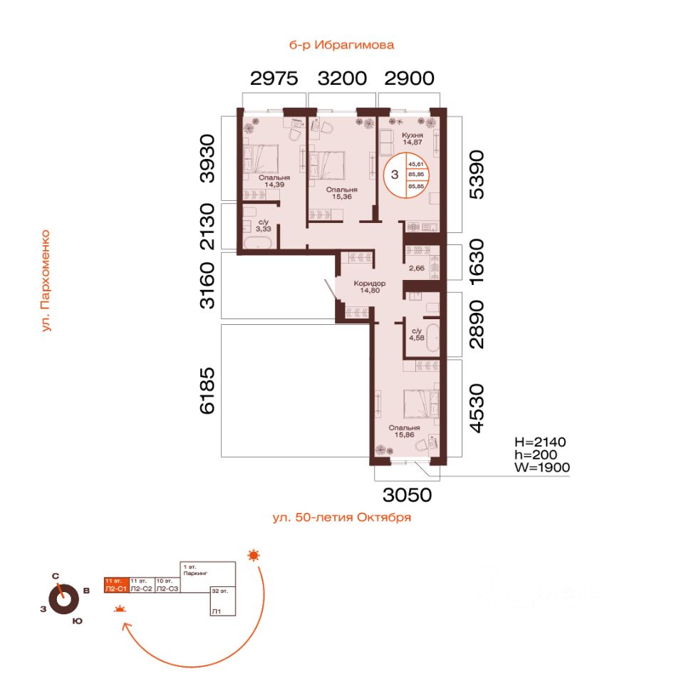 Общая площадь 85.85кв.м.;