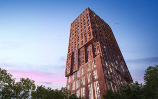 - Узнаваемая архитектура. Эстетичный дуэт: башня высотой 100 метров и 12-этажная секция с монументальными медными колоннами.