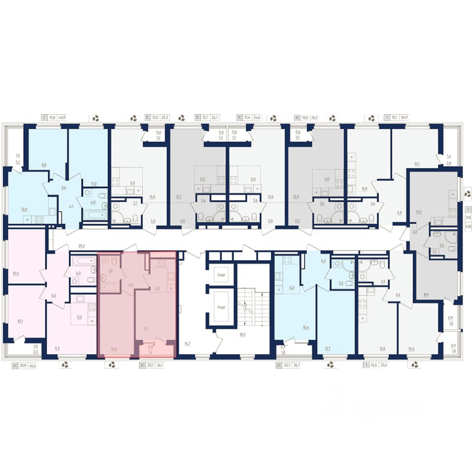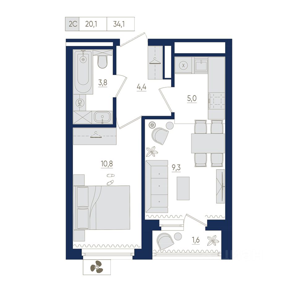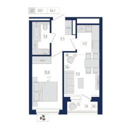5-й этаж 22 - этажного жилого дома, общая площадь 34.1 кв. м., жилая площадь 20.1 кв. м.    Срок окончания строительства: 2 квартал 2026 года