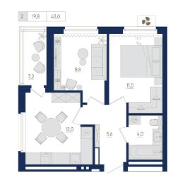 8-й этаж 22 - этажного жилого дома, общая площадь 43 кв. м., жилая площадь 19.8 кв. м. Срок окончания строительства: 2 квартал 2026 года