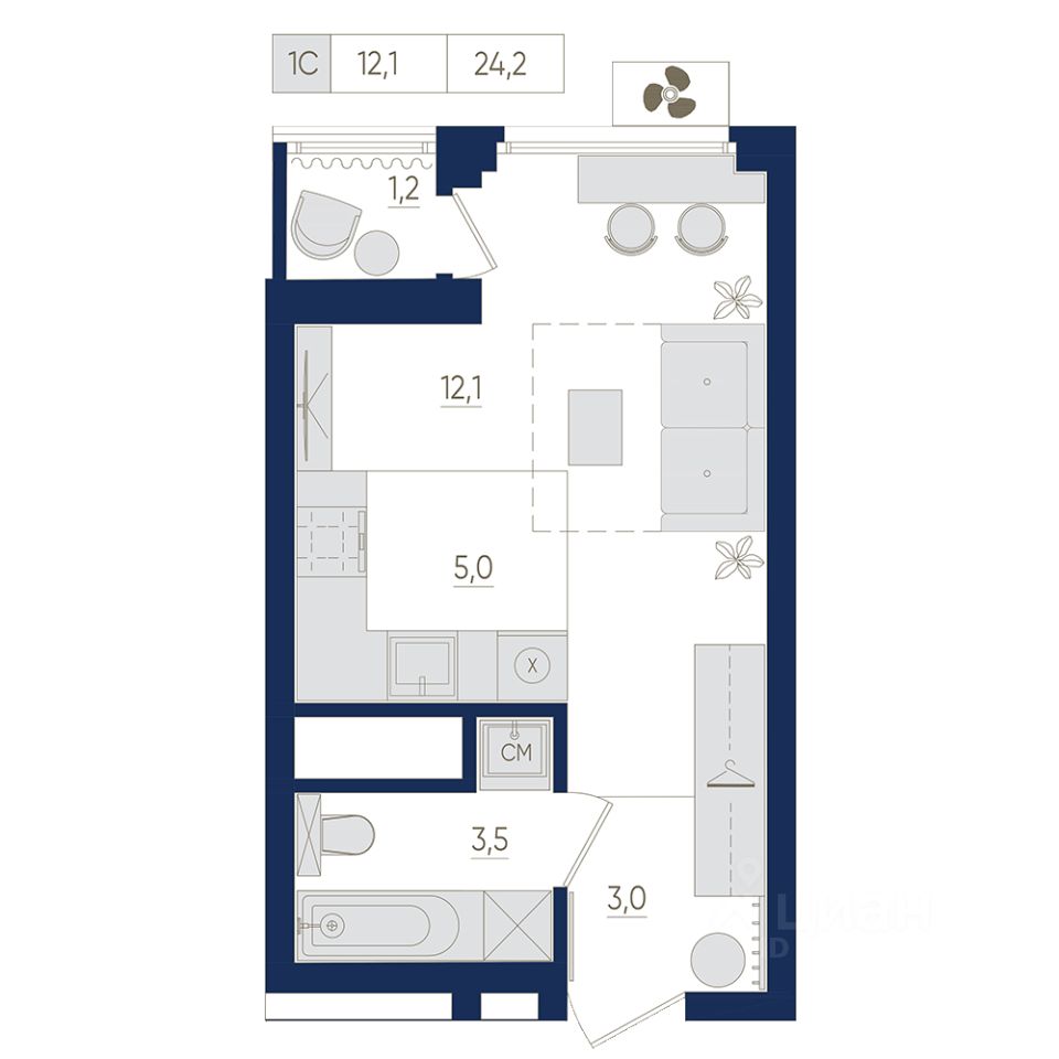 10-й этаж 22 - этажного жилого дома, общая площадь 24.2 кв. м., жилая площадь 12.1 кв. м. Срок окончания строительства: 2 квартал 2026 года