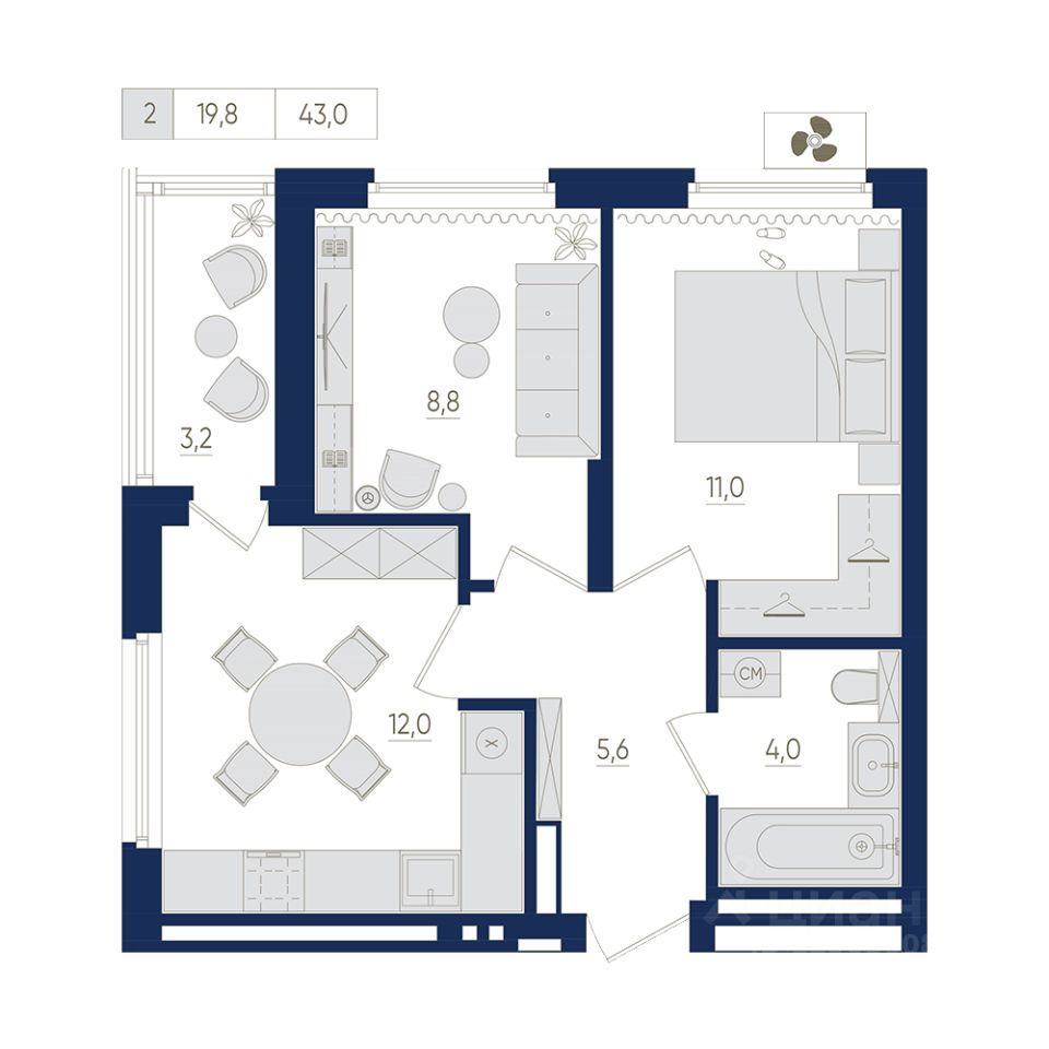 12-й этаж 22 - этажного жилого дома, общая площадь 43 кв. м., жилая площадь 19.8 кв. м. Срок окончания строительства: 2 квартал 2026 года
